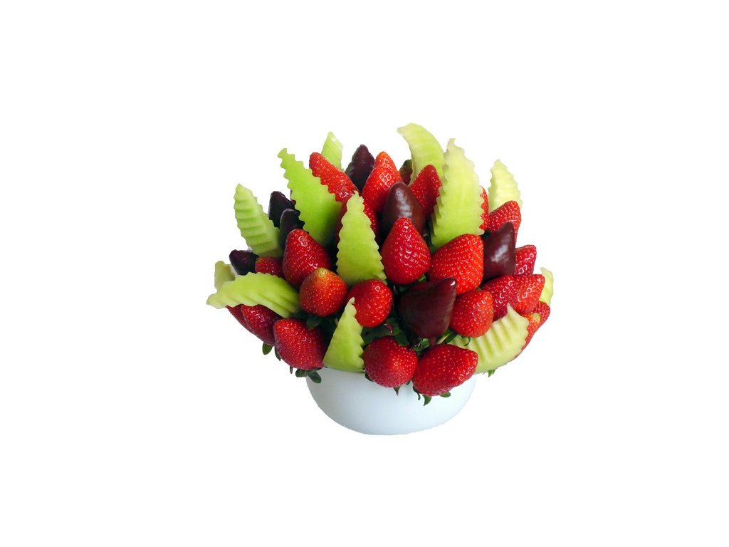 AFRODITA je kytica plná sladkých jahôd, ktorá v kombinácii so zelenými šťavnatými a sviežimi lístočkami melóna Gália vyzerá ako taký jahodový kríček. Niektoré jahody sme poobaľovali aj v mliečnej čokoláde, pre Váš ešte väčší zážitok a pôžitok z chuti. Svojou krásou a jednoduchosťou si isto získa aj Vás, najmä ak jahody sú Vašim obľúbeným ovocím. Môžete si ich vychutnať aj v čokoláde bielej alebo horkej, jej výber závisí len od Vás. Vychutnajte a doprajte si naše lahodné potešenie nielen v lete :).