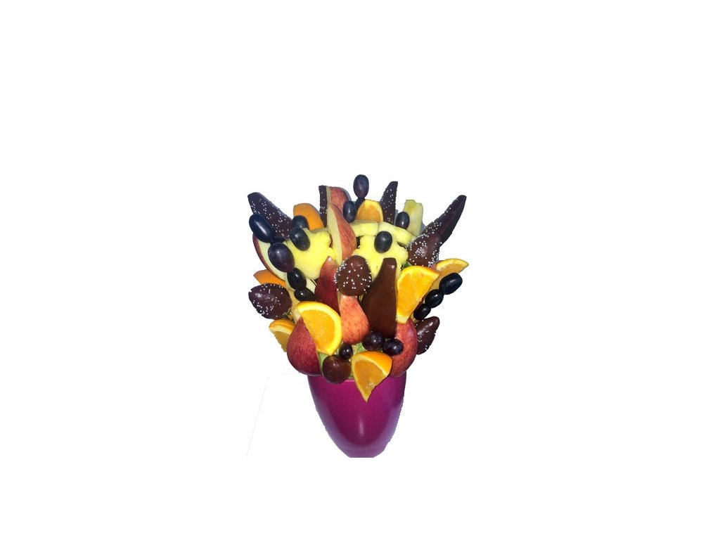 Ovocná kytica "ELISABETH" je elegantná kytica obohatená navyše o hrušky a jahody v čokoláde, ktorých chuť je naozaj fantastická ! Okrem nich si však pochutíte aj na hrozne, jabĺčkach, pomaranči a ananáse.