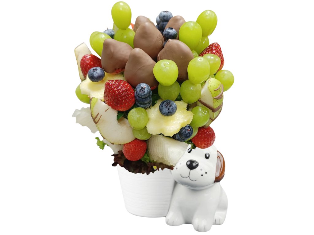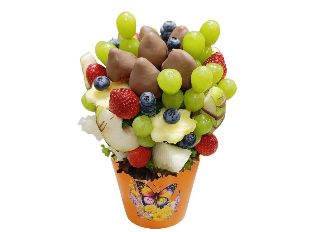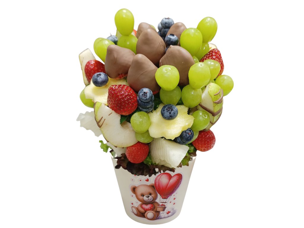 Tak touto ovocnou kytičkou zaiste vykúzlite úsmev na tvári a nadšenie z darčeka nielen u detí :). Veselé keramické nádoby v pastelový farbách s motívmi zvieratiek podľa vášho výberu / motýlik,, žabka, medvedík, psík/ vás pobavia a šťavnaté ovocie v nich naaranžované zase vyskúša vaše chuťové poháriky. Deti si pochutia na 6 druhoch ovocia, v kytičke krásne vyniknú biele lístočky sladučkého žltého melóna ktoré sa striedajú s jahodami. Ďalej si deti pochutia na bielom hrozne, ananásových kvetinkách a čučoriedkach. Neprehliadnuteľné sú i hrušky zdobené belgickou čokoládou podľa vášho výberu no a samozrejme nesmú chýbať ani jahody obalené do čokolády. Kytička je krásnym darčekom pre deti nielen k sviatku, no zaiste ňou svoju ratolesť potešíte i na deň detí alebo ňou môžete pripraviť zdravé pohostenie pre kamarátov do škôlky.