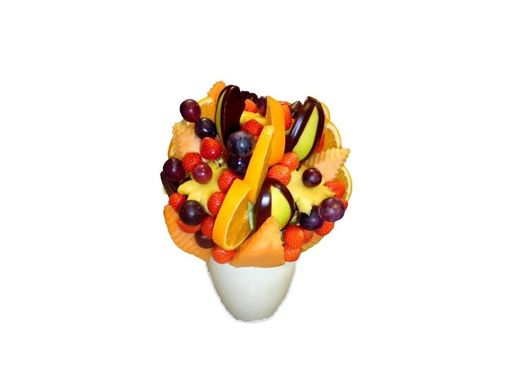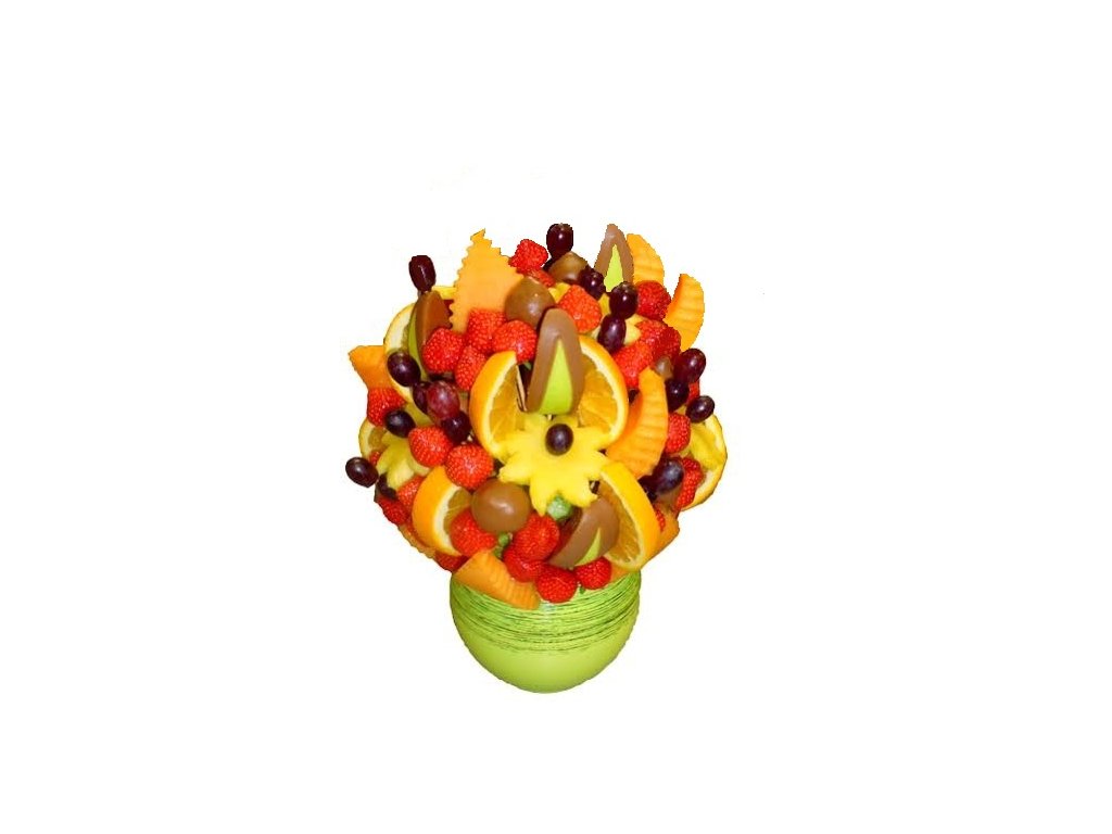 Krásna, pestrá a veľkolepá - to všetko v sebe spája ovocná kytica SUSANE. Zaujímavo krojené ananásovo - hroznové kvety obklopujúce jahodami dopĺňajú pomarančovo sfarbené lístočky melóna Cantaloupe. Sladké tmavé hrozno s jabĺčkami Golden Delicious a jahodami v čokoláde zase vytvárajú v kytici kontrast. A toto všetko skvele podfarbujú polmesiačiky pomaranča. Celá kompozícia tejto kytice je vyvážená, ako do výšky, tak i do objemu. Jej celkový dizajn dotvára aj guľatá keramická nádoba, ktorá je pre SUSANE ako stvorená. Naozaj bohatá a variabilná ovocná kytica, ktorou očaríte a potešíte na každej oslave. Stačí už len pridať vhodné doplnky napr. meno Vášho oslávenca či ovocné číslice, a o zdravý, svieži dezert máte postarané :).